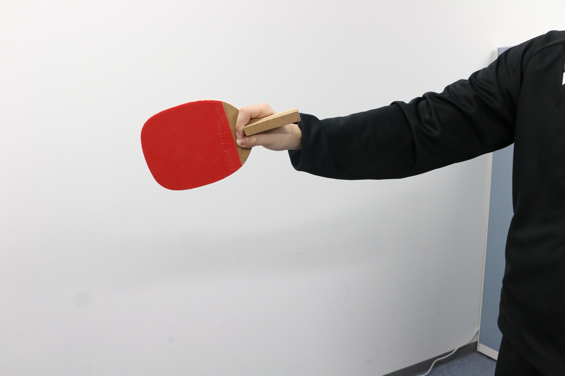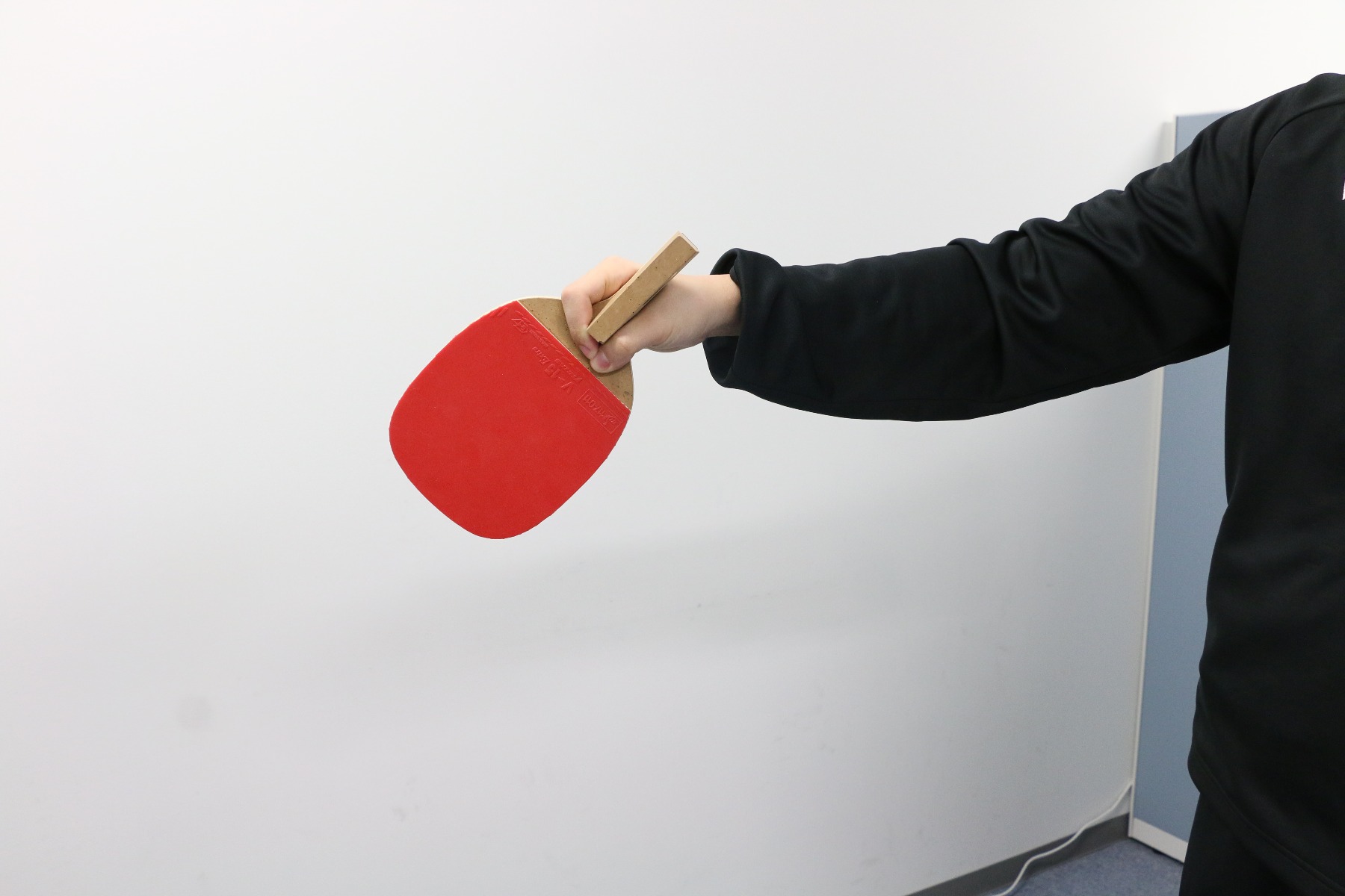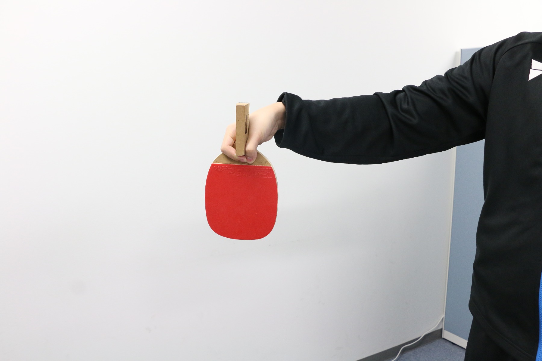 ペンホルダーはシェークハンドに比べてグリップの握りはとても重要。シェークハンド同様に力を入れすぎないように気をつけよう。面が手を伸ばしたときに指先まで平行になるように注意。